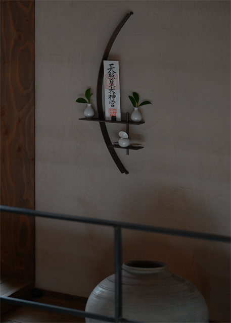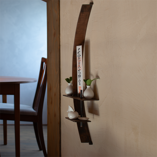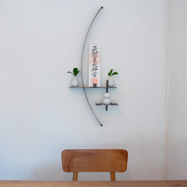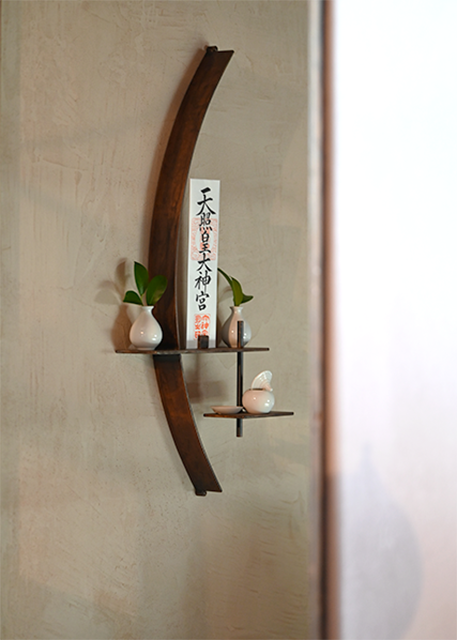 その凜とした姿が一際目を引く、月の円弧をモチーフにした神棚です。