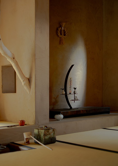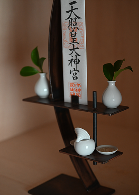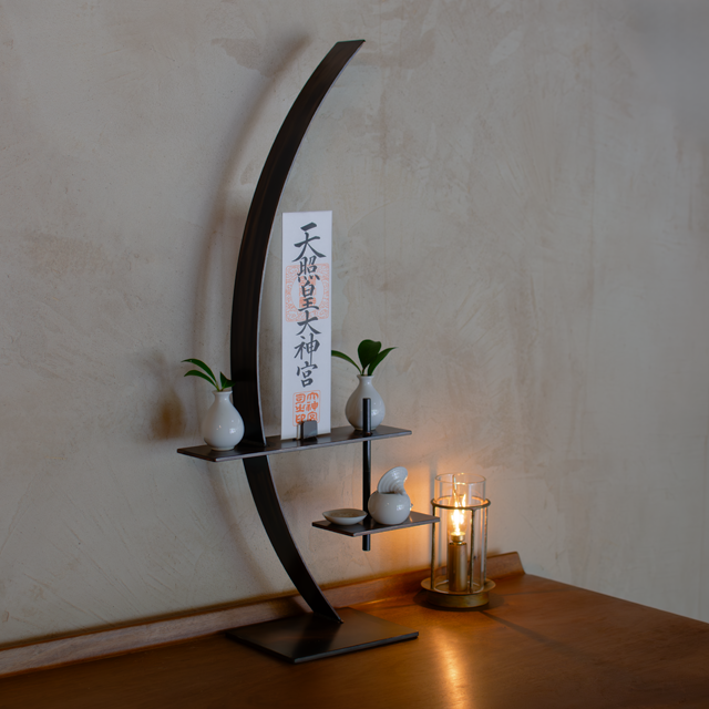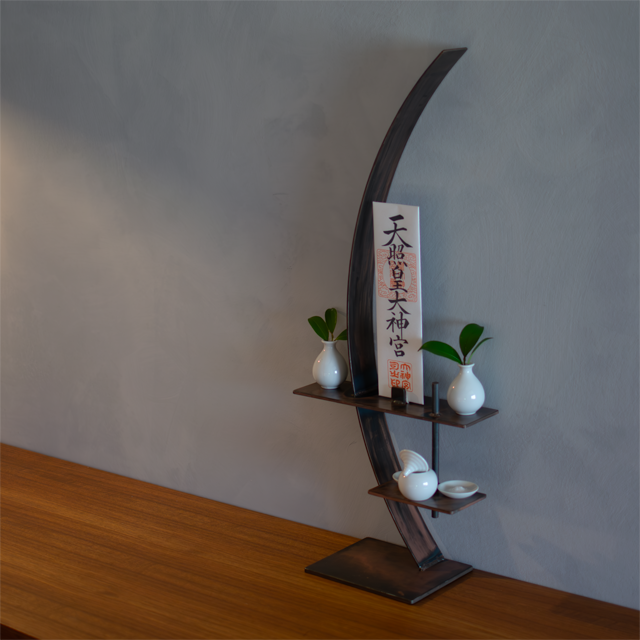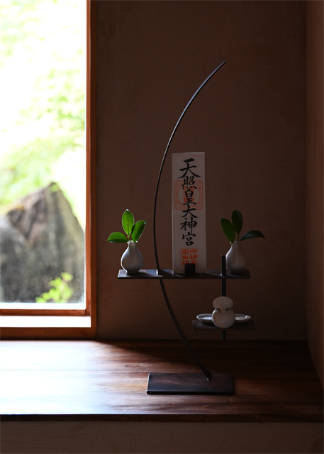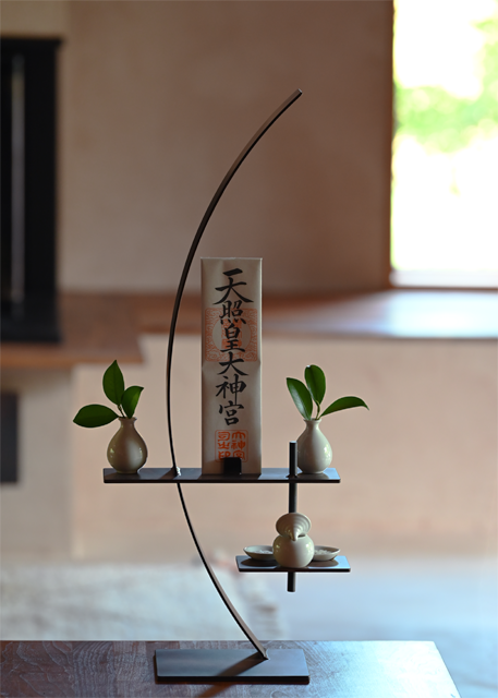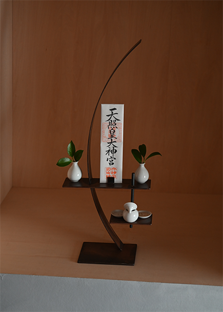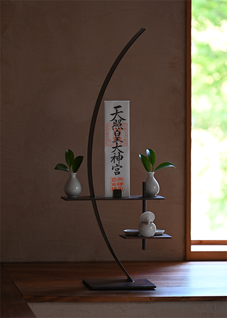 その凜とした姿が一際目を引く、月の円弧をモチーフにした神棚です。
